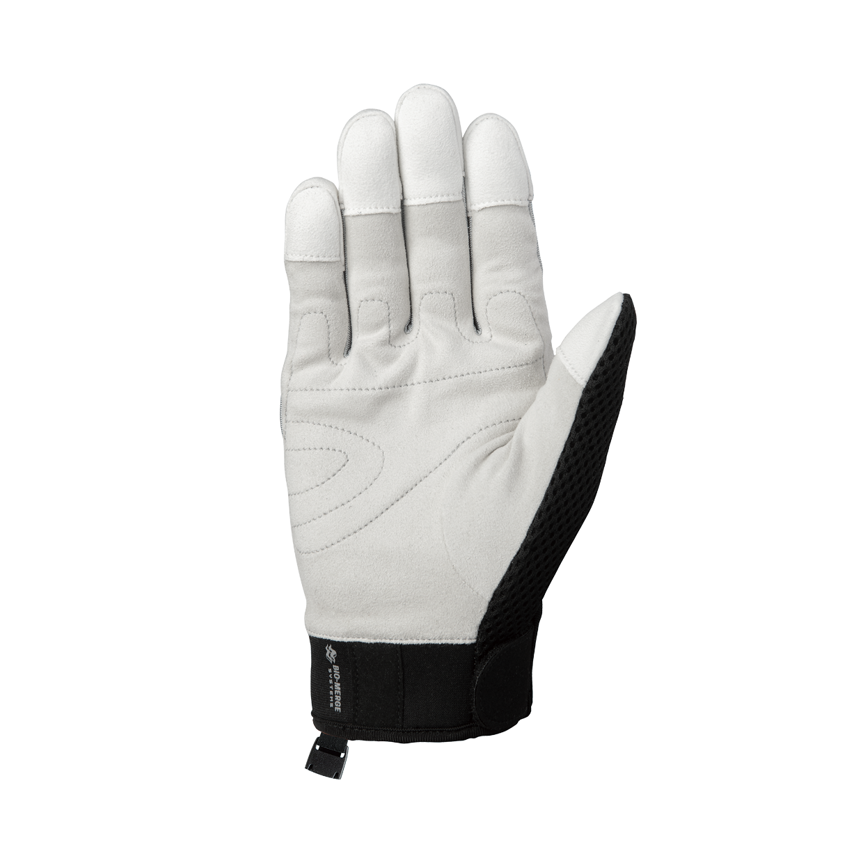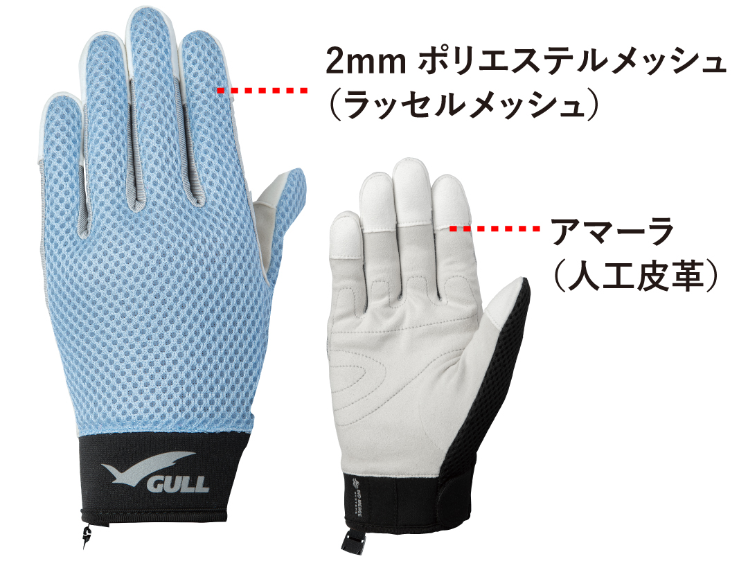手の甲は通気性に優れた、ラッセルメッシュを採用し、よく利用する手のひらの指先は二重のアマーラ(人工皮革)を使用しています。